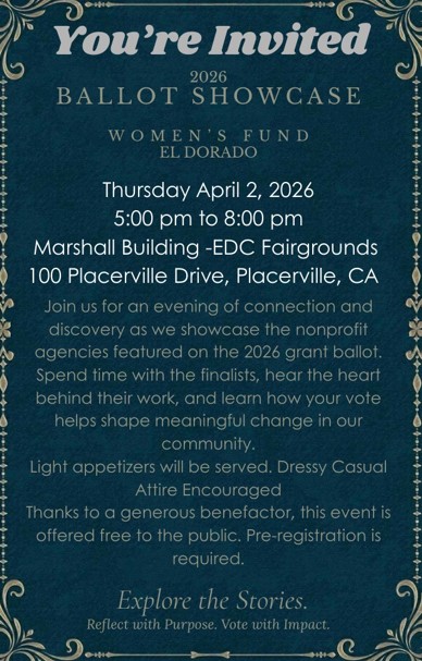 Community members across El Dorado County are being encouraged to mark their calendars for Thursday, April 2, when Women’s Fund El Dorado hosts its annual Ballot Showcase, a key event that helps determine how local philanthropic dollars are distributed.