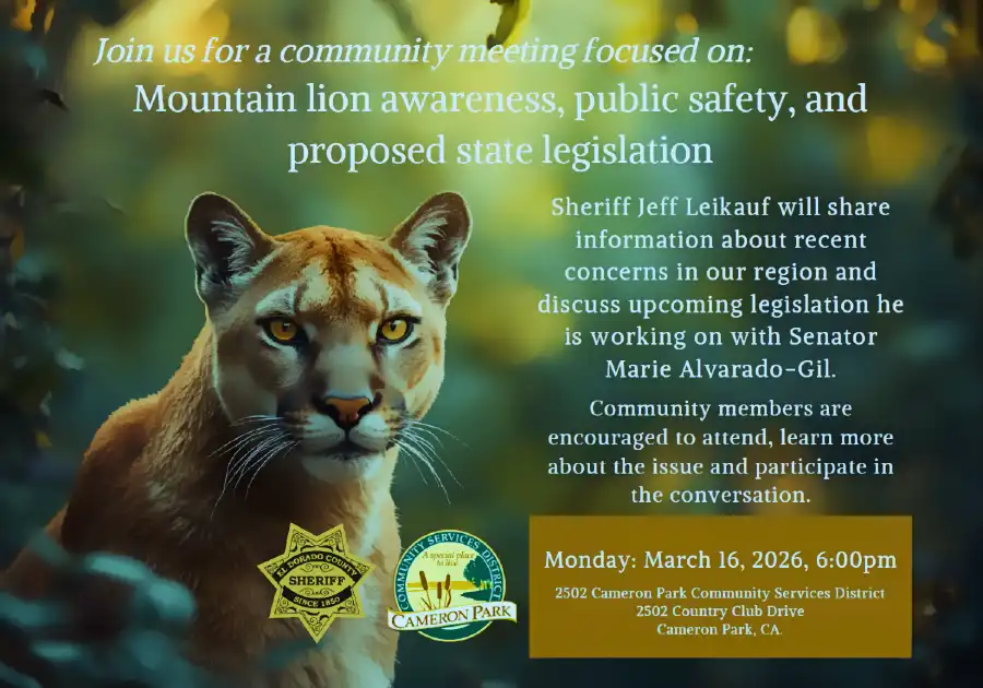 The meeting will be held Monday, March 16, at 6 p.m. at the Cameron Park Community Services District, located at 2502 Country Club Drive in Cameron Park. Officials say the event will provide an opportunity for residents to learn more about recent mountain lion activity in the region and discuss possible legislative solutions.