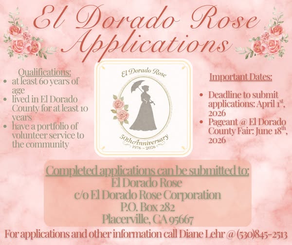 Applications can be obtained by contacting the El Dorado Rose Corporation at (530) 845-2513 or by following updates in the Mountain Democrat. Completed materials should be submitted by mail to the organization’s Placerville post office box.