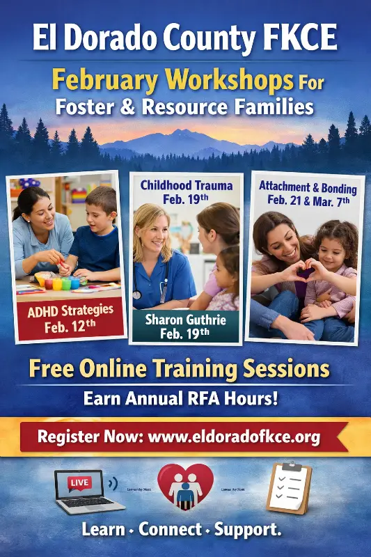 PLACERVILLE, Calif. — El Dorado County’s Foster & Kinship Care Education (FKCE) program is hosting a slate of free online workshops in February 2026 designed to help foster and resource parents fulfill their required annual training hours under California’s Resource Family Approval (RFA) process.