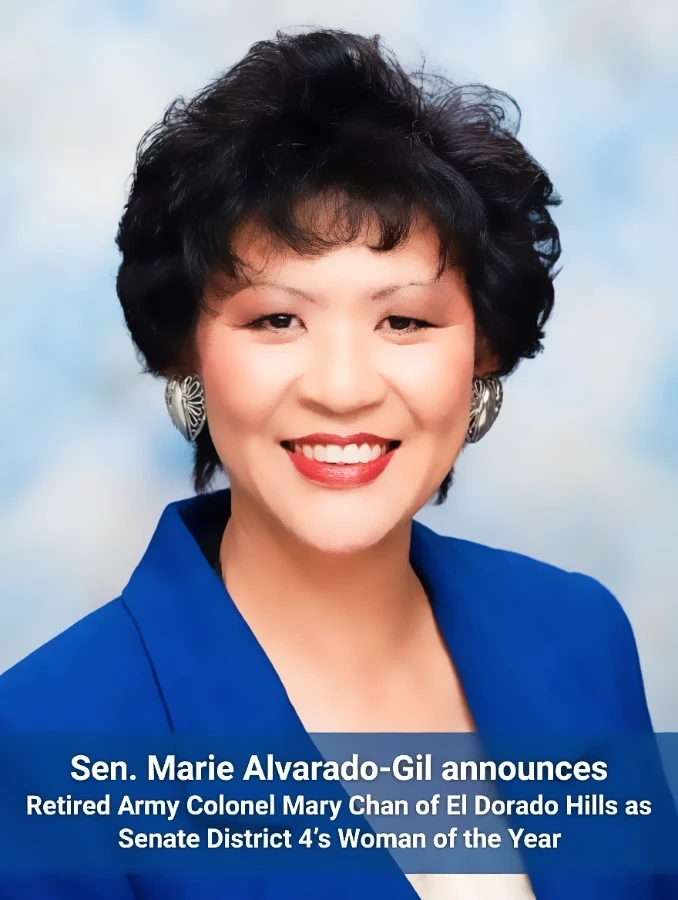 EL DORADO HILLS, Calif. — Retired Army Col. Mary Chan of El Dorado Hills has been named Senate District 4’s 2026 Veteran Woman of the Year by State Sen. Marie Alvarado-Gil, recognizing Chan’s 34 years of military service and continued civic leadership in El Dorado County.