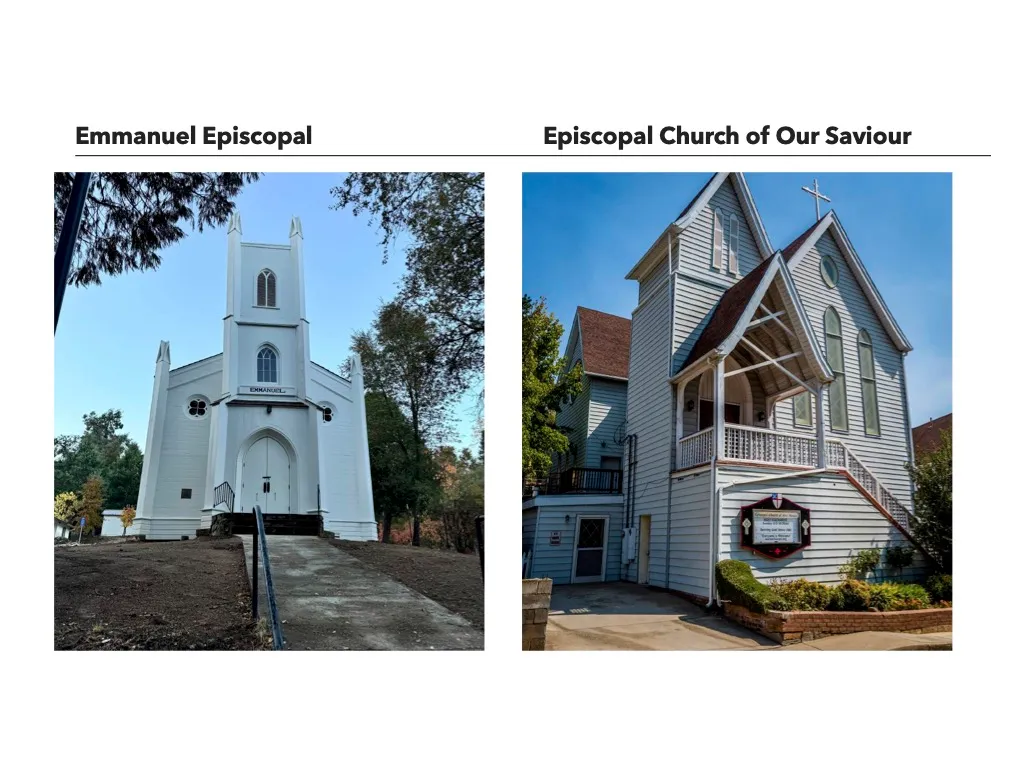 Emmanuel Episcopal Church in Coloma, built in 1855, holds the distinction of being California’s first Episcopal church building. It hosted the funeral of James Marshall, discoverer of gold at Sutter’s Mill, in 1885 . The church was nearly lost to debt in the 19th century but was saved by a personal donation from Bishop William Ingraham Kip, California’s first Episcopal bishop. Today, it is part of the Marshall Gold Discovery State Historic Park and has been recently restored to its mid-19th-century appearance.