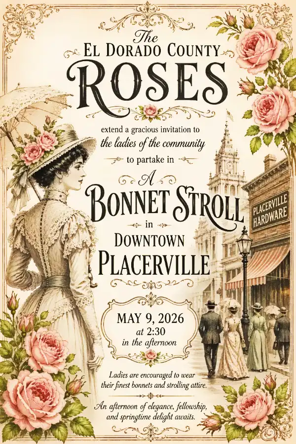PLACERVILLE, Calif. — The El Dorado County Roses are inviting women across the community to step into a scene reminiscent of the Gold Rush era during a Bonnet Stroll set for Saturday, May 9, 2026, at 2:30 p.m. in downtown Placerville.
