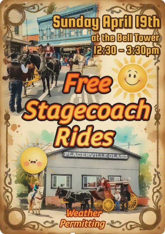 Residents and visitors in Placerville will have a chance to step back in time when free stagecoach rides return to Main Street on Sunday, April 19, 2026. Operating from approximately 12:00 p.m. to 3:30 p.m., the rides depart near the iconic Placerville Bell Tower, offering a rolling glimpse into the Gold Rush era.