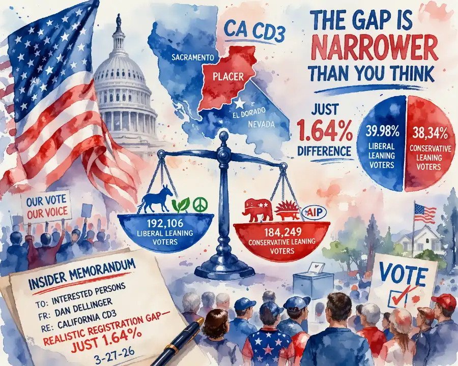 LOTUS, Calif. — A newly circulated memorandum from local political consultant Dan Dellinger is challenging long-held assumptions about voter registration advantages in California’s 3rd Congressional District, suggesting the race may be far more competitive than conventional analysis indicates.