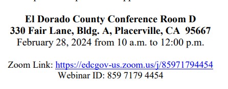 Mark your calendars for February 28, 2024, from 10 a.m. to 12:00 p.m., as El Dorado County residents and stakeholders are invited to share their insights. The meeting will take place at El Dorado County Conference Room D, 330 Fair Lane, Bldg. A, Placerville, CA 95667. For those unable to attend in person, participation is also facilitated through a virtual Zoom meeting.