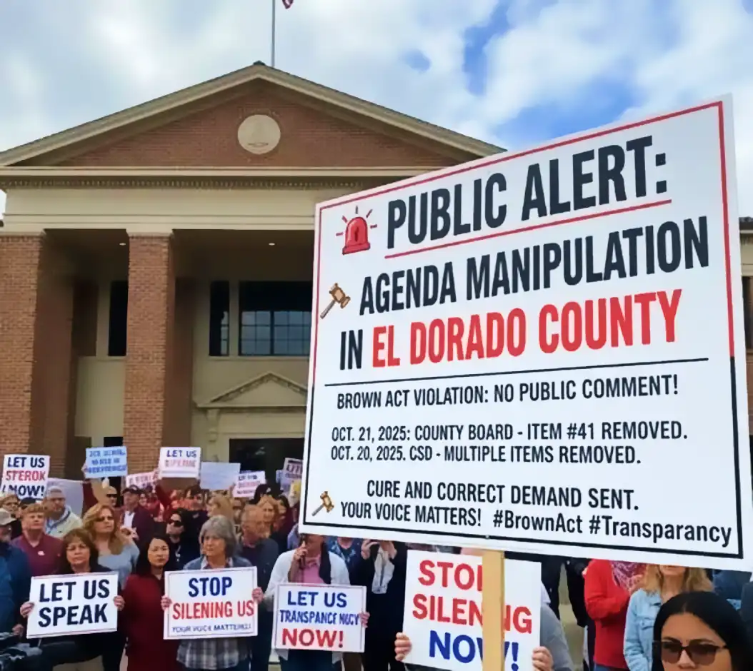 EL DORADO COUNTY, Calif. — A formal demand has been submitted to both the El Dorado County Board of Supervisors (BOS) and the El Dorado Hills Community Services District (CSD), alleging that agenda items have been removed without public comment, thereby limiting citizen participation and potentially violating the state’s open-meeting law, the Ralph M. Brown Act (Gov. Code §§ 54950 et seq.).