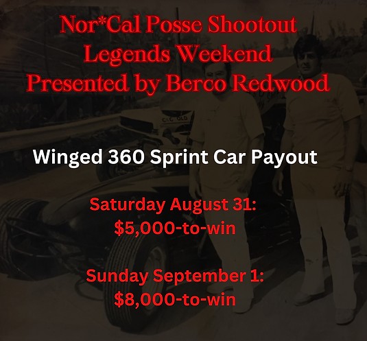 El Dorado County (Aug 20, 2024, 2024) – As the excitement builds for the Nor*Cal Posse Shootout/Legends Weekend, racing enthusiasts have plenty to look forward to this Labor Day weekend. Placerville Speedway is set to host a two-night showdown on August 31st and September 1st, with the Winged 360 Sprint Cars taking center stage. Saturday night offers a tantalizing $5,000-to-win purse, while Sunday raises the stakes with an $8,000-to-win finale.