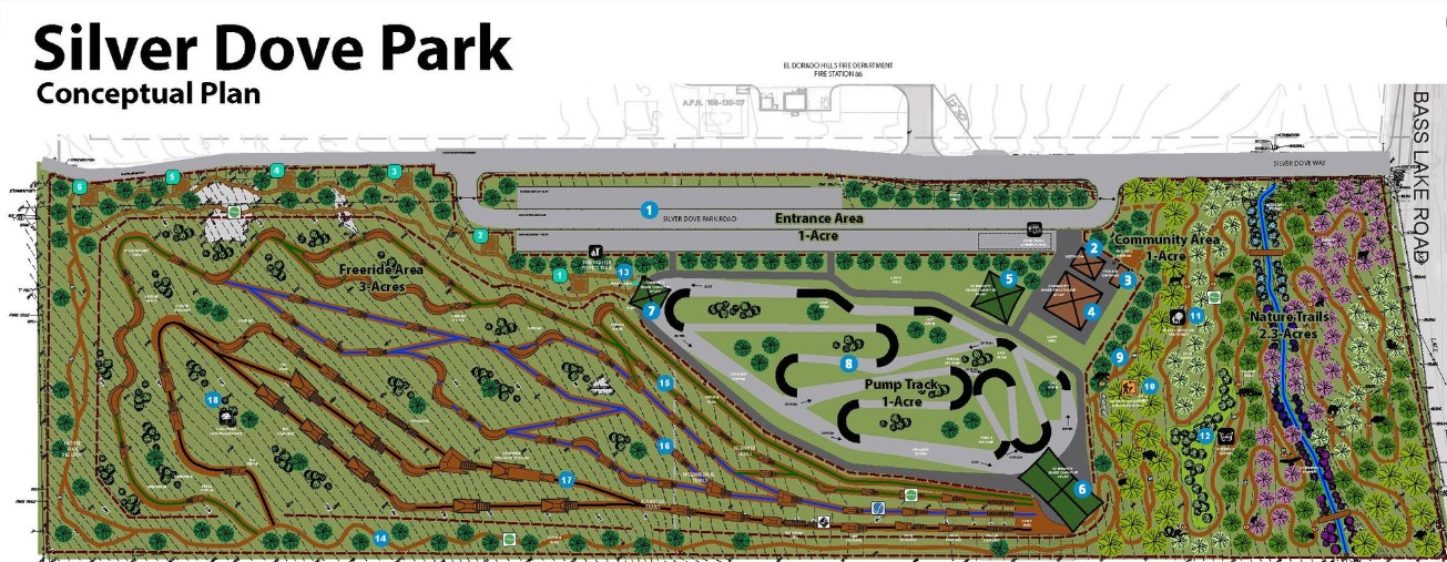 Meanwhile, the Silver Dove Bike Park, proposed along Bass Lake Road adjacent to El Dorado Hills Fire Station No. 86, aims to encompass approximately 9.79 acres. It features a diverse array of amenities, including 3 acres dedicated to freeride areas, a 1-acre pump track, 1 acre reserved for community activities, and 2.3 acres of nature trails complemented by a community orchard. Additionally, the park plans to incorporate a .25-mile firefighter fitness loop, parking facilities for around 80 vehicles, hook-ups for food vendors, restrooms, and shade canopies.