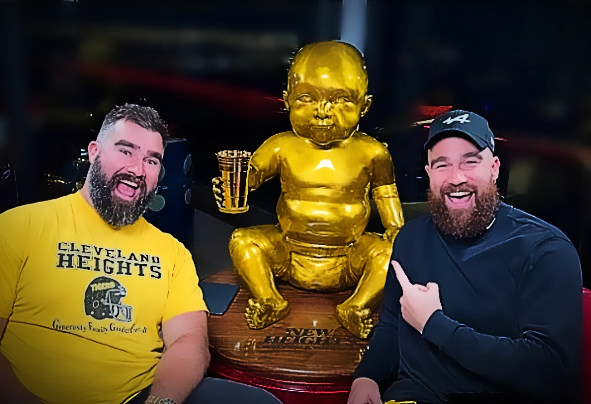 Amidst the Super Bowl fervor, the Kelce brothers eagerly unveiled the Golden Baby to their podcast fans. Jason Kelce exclaimed on the podcast, “Feast your eyes on the new Heights Trophy, the Golden Baby! Isn’t it glorious?” The trophy’s significance lies in its origin, as Jason Kelce’s request for a cast bronze baby stems from an early career experience where he signed a baby, symbolizing his achievement.