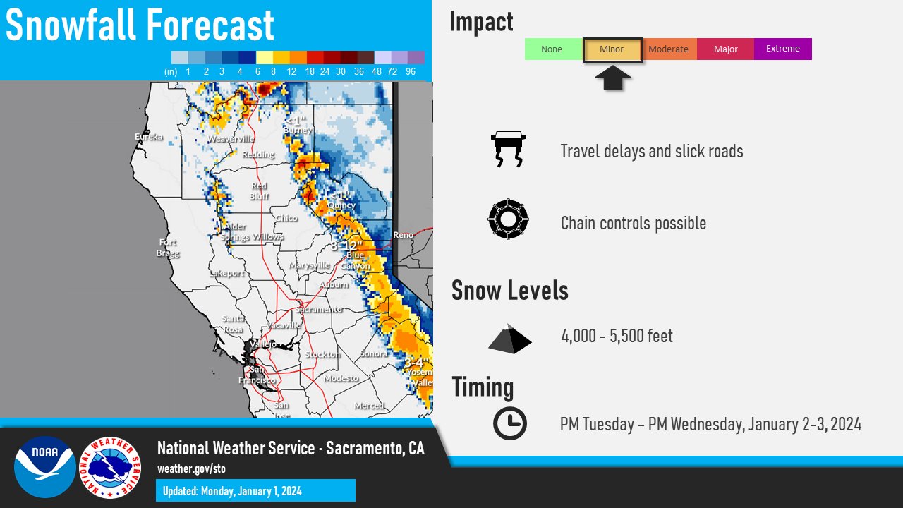 Prepare for a wintry blast as a Winter Weather Advisory takes effect in the Pollock Pines area from January 2, 10:00 PM PST until January 4, 04:00 AM PST. The latest forecast reveals an uptick in snowfall totals for the upcoming storm on Tuesday and Wednesday, heightening concerns for hazardous conditions.