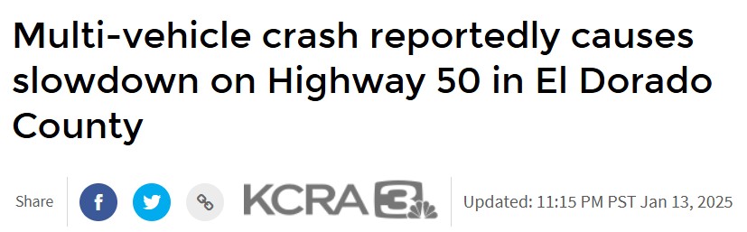 El Dorado County (Jan 13, 2025) – CAMERON PARK, Calif. — A collision involving at least three vehicles has led to significant slowdowns on Highway 50 in El Dorado County. According to the California Highway Patrol (CHP) traffic logs, the incident occurred in the westbound lanes near Cameron Park Drive around 2:20 p.m.