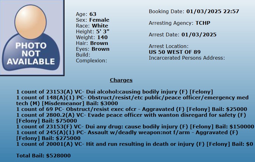 The pursuit concluded in Meyers at a chain control area, where Alestri’s Prius collided head-on with a westbound sport utility vehicle (SUV). The SUV’s five occupants sustained minor injuries, while Alestri emerged unscathed. She was subsequently arrested and booked into the El Dorado County Jail in South Lake Tahoe, with bail set at $403,000. Her charges include felony counts of driving under the influence causing bodily injury, evading a peace officer with wanton disregard for safety, and obstructing or resisting an executive officer, as well as a misdemeanor charge of obstructing or resisting a public or peace officer.