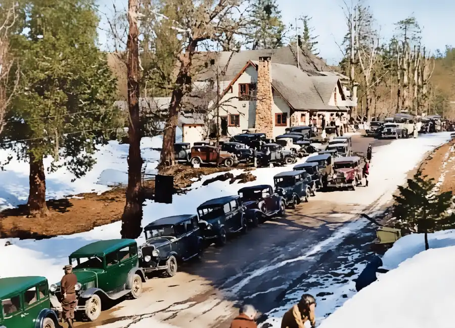 Photographs from the 1920s show automobiles crowding the dirt roadway in front of the building while a traffic officer in tall boots walks among parked cars—an early sign of the automobile era transforming the Sierra corridor.