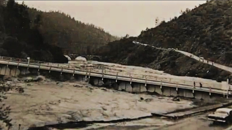 American River (March 13, 2024) – On December 23, 1964, the State Route 49 bridge over the North Fork American River just below Auburn was washed away. Hell Hole Dam, being built for Placer County Water Agency (PCWA) on the Rubicon River, failed during an extreme precipitation. The failure of the partially built dam sent a wave of water and debris downstream into the Middle Fork American, where it eventually reached the Confluence and destroyed the Georgetown Bridge.
