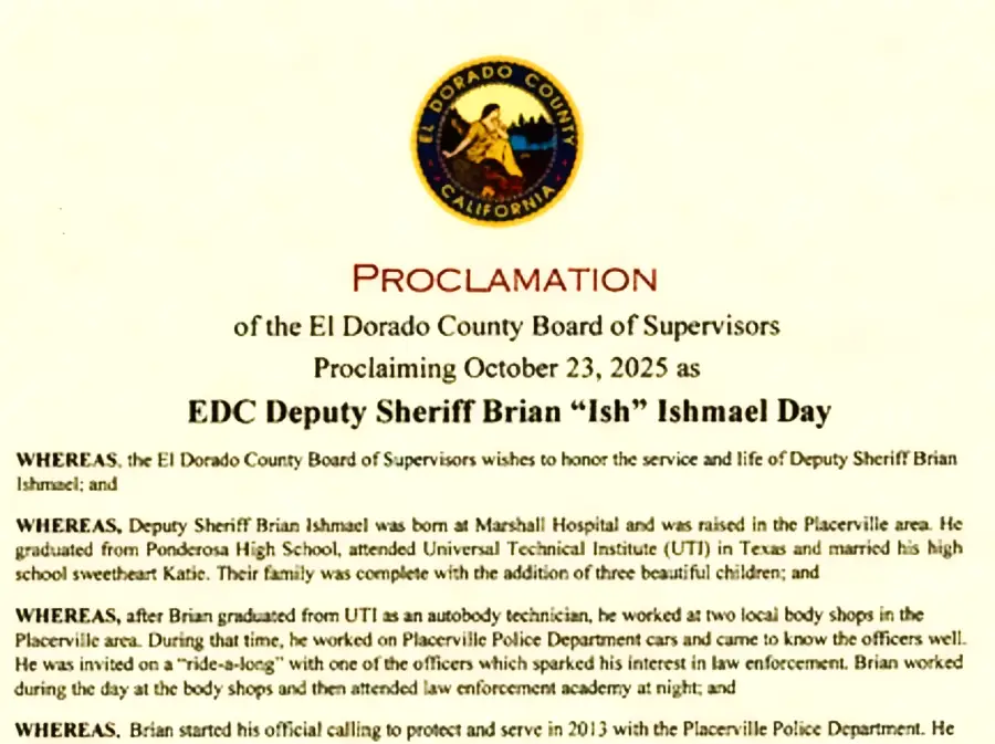 “May this proclamation be a testament of our profound gratitude and appreciation of Deputy Sheriff Brian Ishmael’s ultimate sacrifice and legacy of service to the citizens of El Dorado County.”