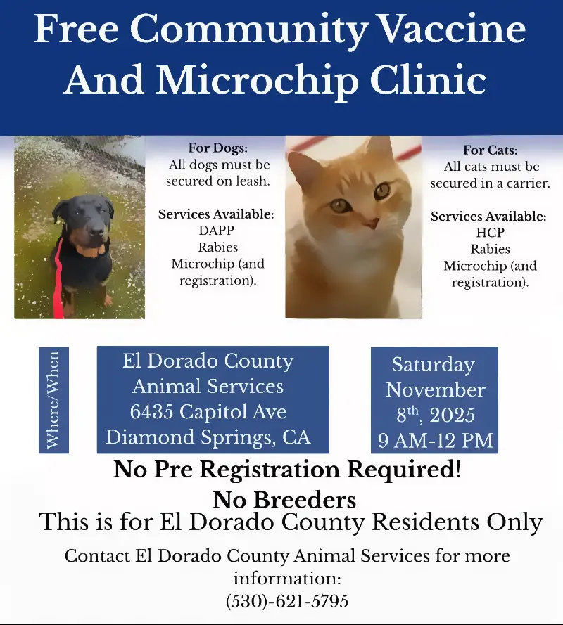 Diamond Springs, Calif. — El Dorado County pet owners can get free vaccinations and microchips for their dogs and cats on Saturday, Nov. 8, 2025, when the El Dorado Humane Society and partners host a community clinic at El Dorado County Animal Services in Diamond Springs.