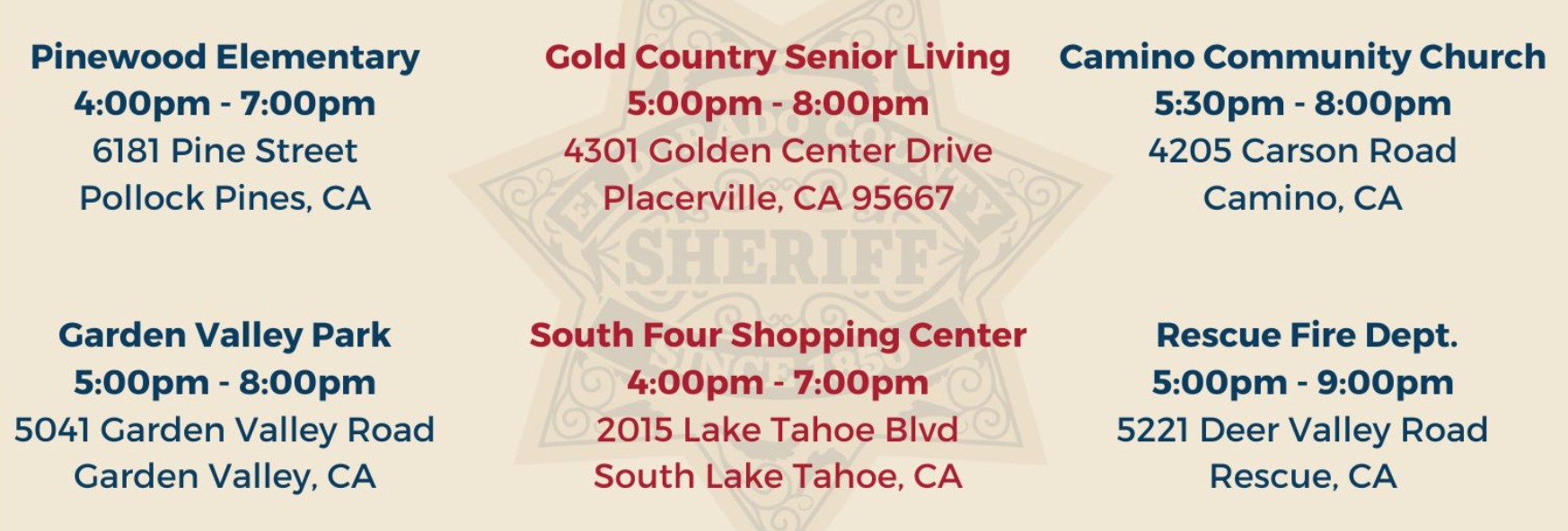 Join us for a night of community and camaraderie! We invite you to come out and visit with us in Pollock Pines, Placerville, Camino, Garden Valley, Rescue, and South Lake Tahoe. It’s the perfect occasion to get to know your neighbors and local law enforcement, all while enjoying a fun-filled evening.