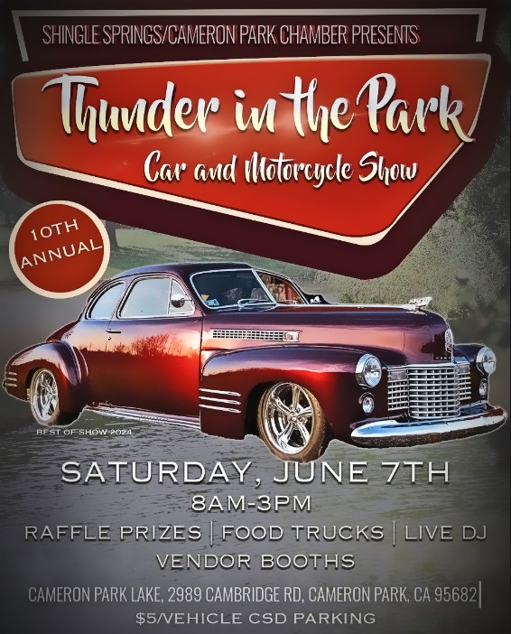 Cameron Park, Calif. — The Shingle Springs/Cameron Park Chamber of Commerce is set to host the 10th Annual Thunder in the Park Car & Motorcycle Show on Saturday, June 7, 2025, at Cameron Park Lake, located at 2989 Cambridge Road. The event will run from 8 a.m. to 3 p.m., offering a day filled with classic vehicles, live entertainment, and community engagement.
