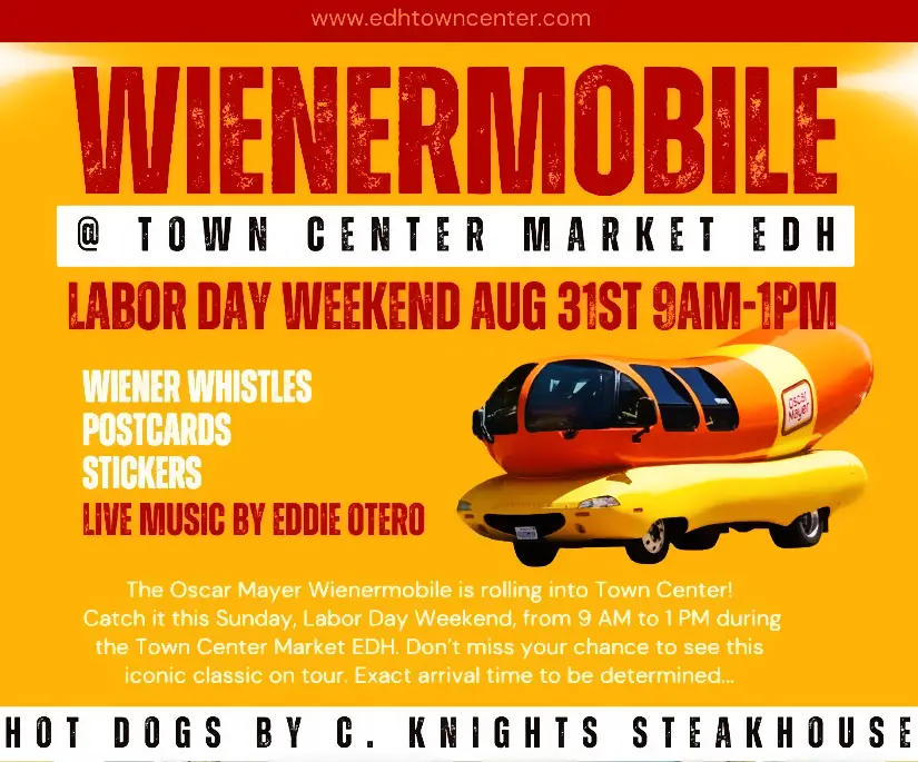 El Dorado Hills Town Center promoted the visit on social media, inviting families for photo ops and souvenirs. “The Oscar Mayer Wienermobile is rolling into Town Center Market EDH on Sunday… and we are thrilled to host it for Labor Day Weekend,” the center said in its announcement. The post also notes free “Weenie Whistles,” stickers and postcards, plus hot dogs from C. Knights Steakhouse and USDA meats from Mountain Lake Cattle Co. during market hours.