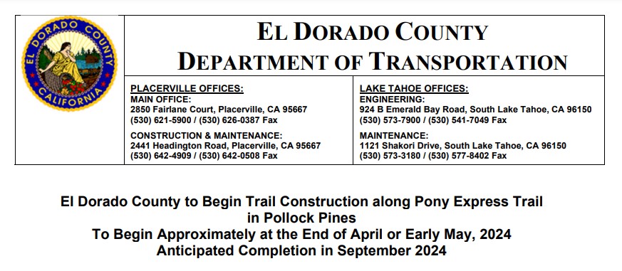 By Cris Alarcon, Staff Reporter, Pollock Pines (April 23, 2024) -In a bid to promote safer and more accessible travel, El Dorado County is set to commence construction along the historic Pony Express Trail, ushering in a new era of pedestrian and cycling infrastructure in Pollock Pines.