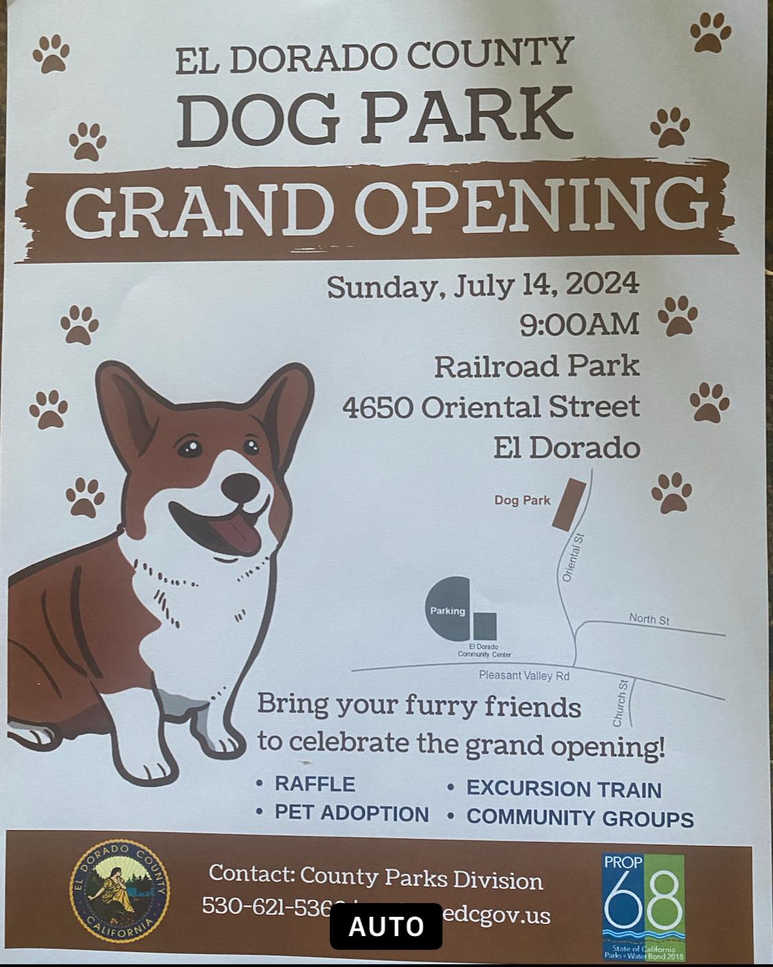 El Dorado (July 10, 2024) –  El Dorado County is set to celebrate the grand opening of its first official dog park on Sunday, July 14th, at the Historical Railroad Park in El Dorado. The event will commence at 9:00 a.m.