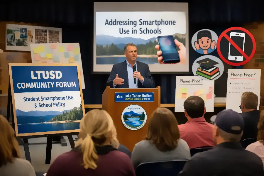 The evening forum, held in South Lake Tahoe, included representatives from the Superintendent’s Student Advisory Committee and district leadership. Superintendent Dr. Todd Cutler opened the meeting by acknowledging what he described as growing academic and social challenges linked to smartphones in schools.