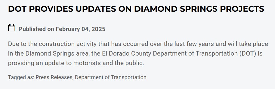 Diamond Springs, CA – The El Dorado County Department of Transportation (DOT) has provided an update on recent and upcoming construction projects in the Diamond Springs area, aiming to enhance infrastructure and improve safety for residents and motorists.