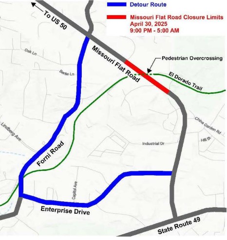 PLACERVILLE, Calif. (April 15, 2025) — The El Dorado County Department of Transportation (DOT) has announced an overnight closure of Missouri Flat Road to facilitate the installation of a prefabricated steel truss bridge as part of the El Dorado Trail Pedestrian Overcrossing Project.