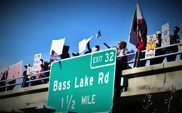 Protests dotted 10 overpasses along Highway 50, including key pedestrian bridges near Folsom, Cameron Park, Diamond Springs, and Placerville. Each site operated between 10 a.m. and noon, part of a synchronized “visibility protest” timed to coincide with President Trump’s birthday, Flag Day, and the 250th anniversary of the U.S. Army.