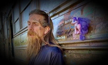PLACERVILLE, Calif. May 26, 2022 — Suicide Awareness bus owner Cory Richez. 42, of Pietown, New Mexico, stands near a My Little Pony toy attached to the bus saying it was given to him by a grieving mother whose ten-year-old beauty pageant queen hung herself with an electrical cord in a closet after hearing the former 2019 Miss USA, Cheslie Kryst died by suicide in New York City in February of this year.