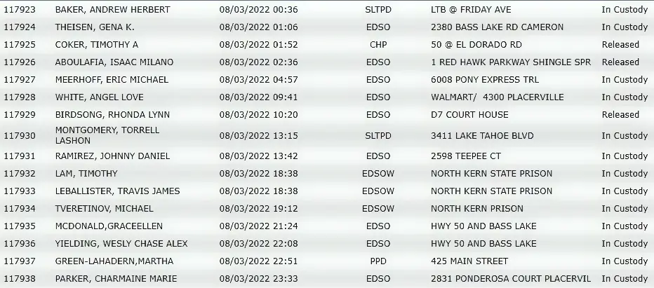 Occurred on Tepee Ct, in South Lake Tahoe. . Disposition: ARREST .