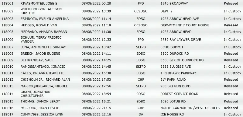 El Dorado County Sheriff (PLACERVILLE, CALIFORNIA) Aug 9, 2022 —
