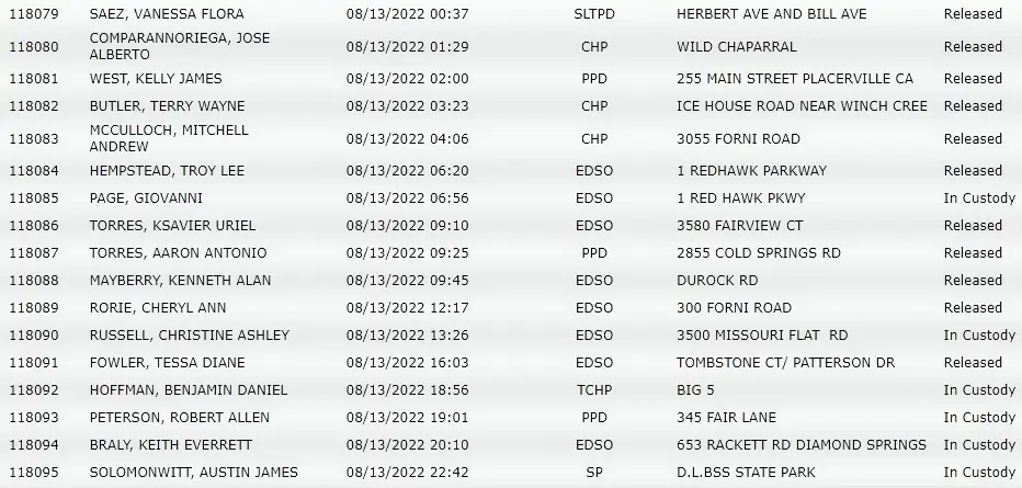 Occurred on Texerna Ct, in Placerville. . Disposition: CHECKS CLEAR.