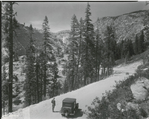 Photo, c.1931, shows a driver stopped on the road taking in the view of Pyramid Falls at Twin Bridges. You can see the falls off in the distance.