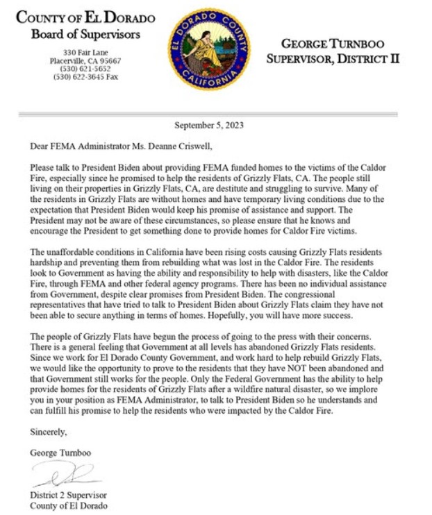 Grizzly Flats, CA – Supervisor George Turnboo, a dedicated public servant well-versed in crisis management, has taken a proactive approach to ensure the residents of Grizzly Flats receive the assistance they need for rebuilding their homes. In a poignant move, Turnboo recently penned a letter to FEMA Administrator Deanne Criswell, urging the agency to prioritize housing support for those affected by the devastating Caldor Fire.